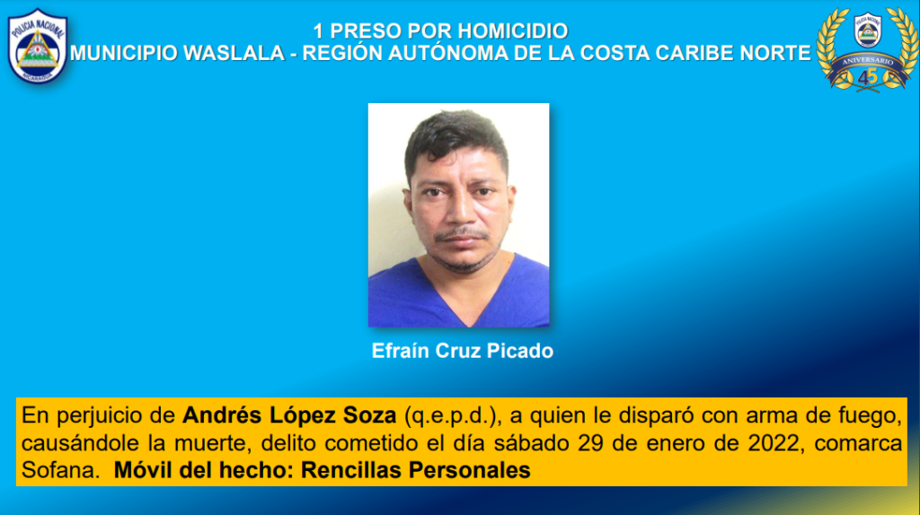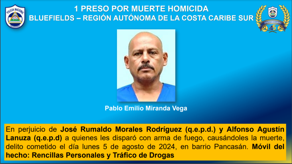 Entre los homicidas capturados se encuentran Pablo Emilio Miranda Vega, de la Región Autónoma de la Costa Caribe Sur y Efraín Cruz Picado, de la Región Autónoma de la Costa Caribe Norte.