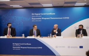 El presidente del Consejo Europeo, Charles Michel, y el Gobierno griego presentaron en Atenas el certificado digital de vacunación contra