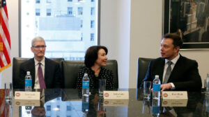 De izquierda a derecha: Tim Cook, Safra Catz y Elon Musk, directores ejecutivos de Apple, Oracle y Tesla, durante una