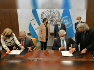 La rúbrica del acuerdo para la Comisión Internacional Contra la Corrupción e Impunidad en Honduras (Cicih) se llevó a cabo