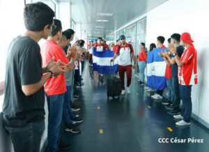 Jóvenes del Movimiento Deportivo Alexis Argüello y directivos del equipo de fútbol Real Estelí, recibieron este jueves en el Aeropuerto