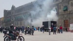Estudiantes normalistas de Ayotzinapa lanzaron petardos a la fachada de Palacio Nacional en Ciudad de México, sede del Ejecutivo mexicano, la tarde