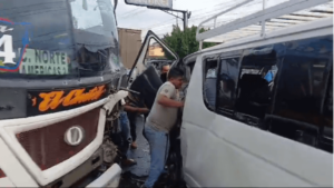 El conductor de un microbús escolar identificado como Eduardo Almendárez, de 70 años de edad, terminó prensado y herido luego
