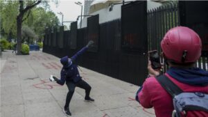 Un grupo de manifestantes que claman justicia por el caso de los 43 estudiantes normalistas desaparecidos en Ayotzinapa en 2014,