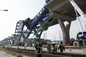Una grúa gigante colapsó este viernes en una obra vial al oeste de Bangkok, capital de Tailandia, causando la muerte