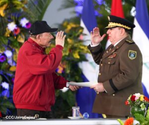 Tomado de El 19 Digital/. Comandante Daniel Ortega, Copresidente de Nicaragua, al entregar el bastón de mando al General Julio