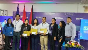 Los estudiantes Junniet Rebeca Gaitán Arévalo, Hensell Dodaning Delgado, ambos de la Universidad Nacional de Ingeniería y Leonel Antonio Flores