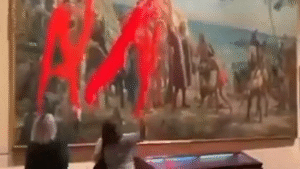 Activistas del colectivo ambientalista Futuro Vegetal lanzaron pintura roja “biodegradable” a un cuadro de Cristóbal Colón en el Museo Naval de
