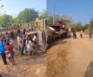 Un autobús, presuntamente sobrecargado de pasajeros, se volcó en las cercanías de la comunidad de Jiñocuabo, afortunadamente no hubo lesionados