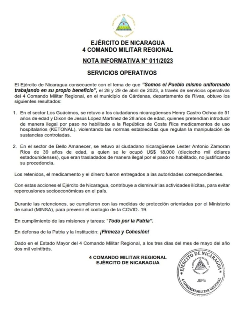 En el sector Los Guácimos, se retuvo a los ciudadanos nicaragüenses Henry Castro Ochoa de 51 años de edad y Dixon de Jesús López Martínez de 28 años de edad, quienes pretendían introducir de manera ilegal por paso no habilitado a la República de Costa Rica medicamentos de uso hospitalarios (KETONAL), violentando las normas establecidas que regulan la manipulación de sustancias controladas.