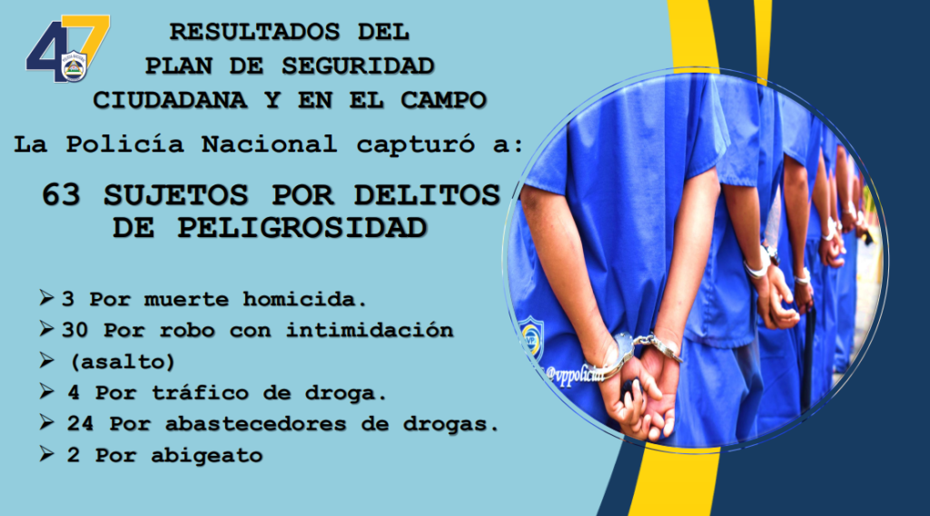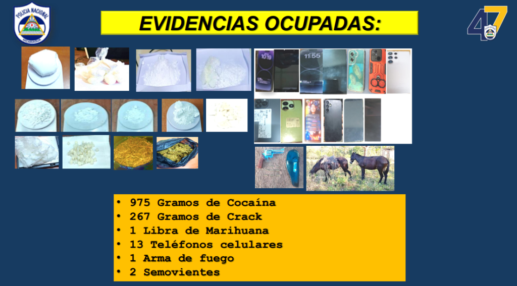 La Cojefa de Relaciones Públicas de la Policía Nacional, comisionada Karen Obando, detalló que durante los operativos a los capturados se les ocupó diversas evidencias, entre ellas 975 gramos de cocaína, 267 gramos de crack, una libra de marihuana, un arma de fuego, 13 teléfonos celulares y dos semovientes.