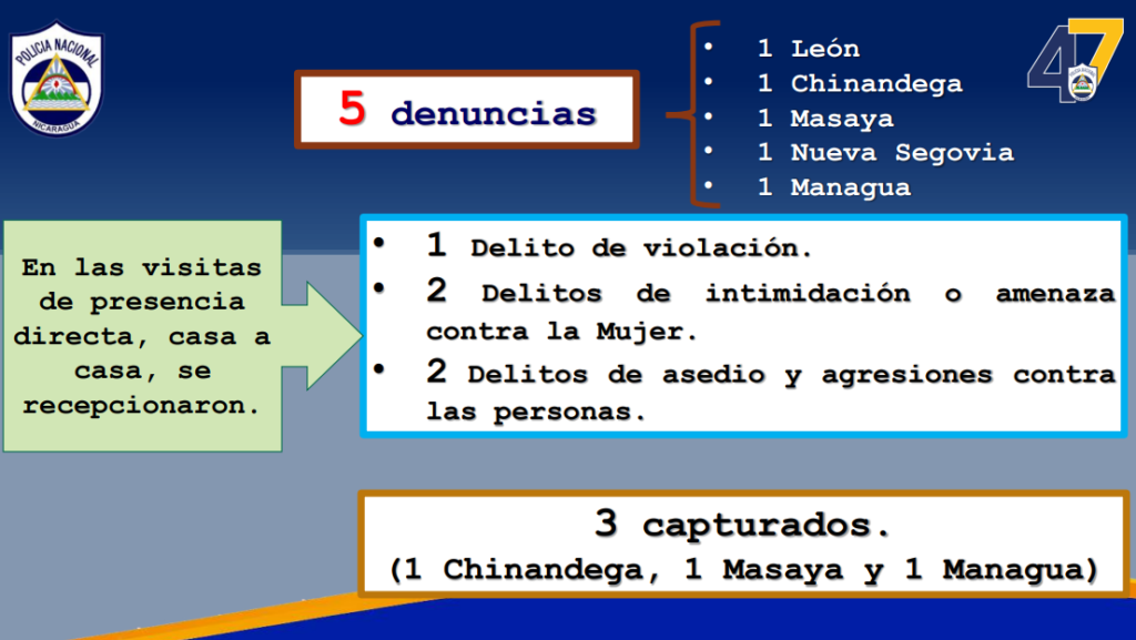 Como parte del plan de prevención dirigido a madres de familia, se efectuaron 19 mil 880 visitas casa a casa, 130 asambleas comunitarias y conversatorios con más de 12 mil participantes, donde se recepcionaron cinco denuncias por delitos que afectan la integridad de mujeres, logrando la captura de tres agresores en Chinandega, Masaya y Managua.