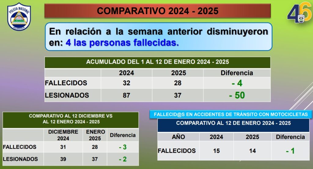 En accidentes de tránsito, perdieron la vida en los primeros doce días de enero, 28 personas y otras 37 resultaron lesionadas, cifras que en comparación al mismo período del año pasado, refleja una disminución de menos cuatro muertos y menos 50 heridos.