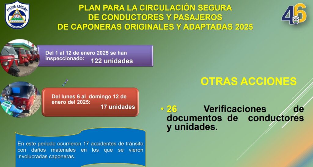 En relación al Plan para la Circulación Segura de Conductores y Pasajeros de Caponeras, se inspeccionaron del 1 al 12 de enero, 122 unidades, período en el que se reportaron 17 accidentes de tránsito en los que se vieron involucradas caponeras y que dejaron sólo daños materiales.