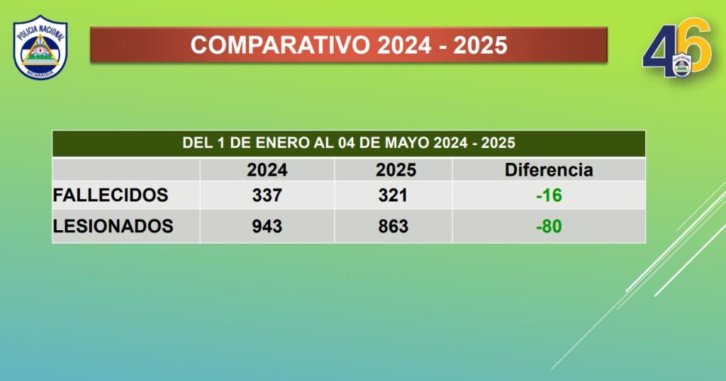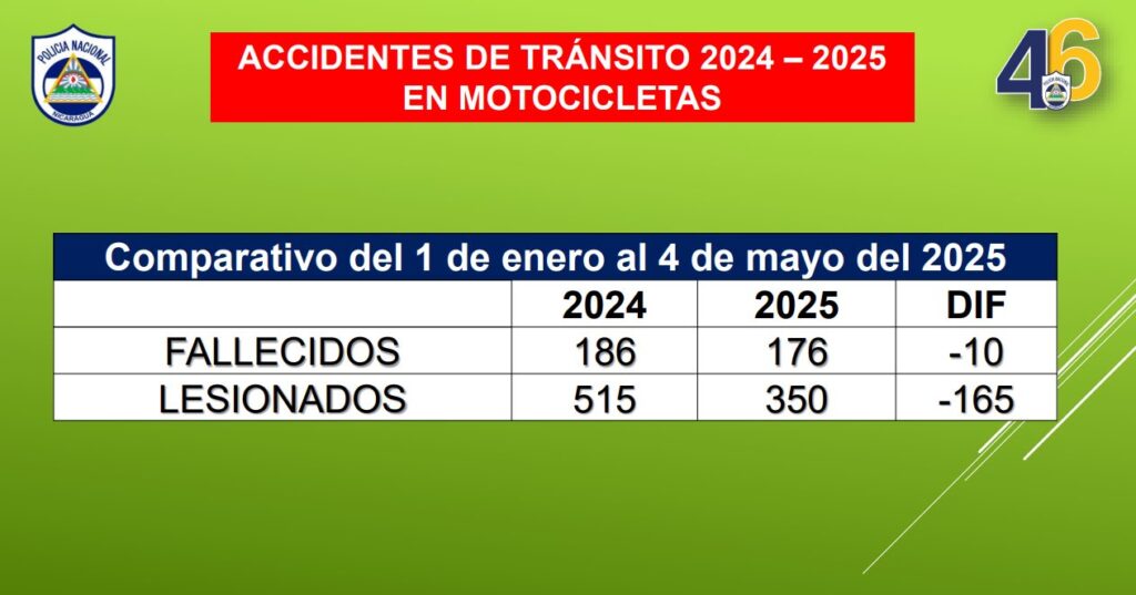 “En el comparativo 2024-2025 del periodo del primero de enero al 4 desde mayo del 2024 a 2025, en fallecidos tenemos menos 16, en lesionados tenemos menos 80. En accidente de tránsito donde están involucradas las motocicletas 2024-2025 en este comparativo del primero de enero al 4 de mayo del 2025, tenemos menos 10 fallecidos y menos 165 los lesionados”, declaró la Cojefa de Relaciones Públicas de la institución del orden público, subcomisionada Karen Obando.