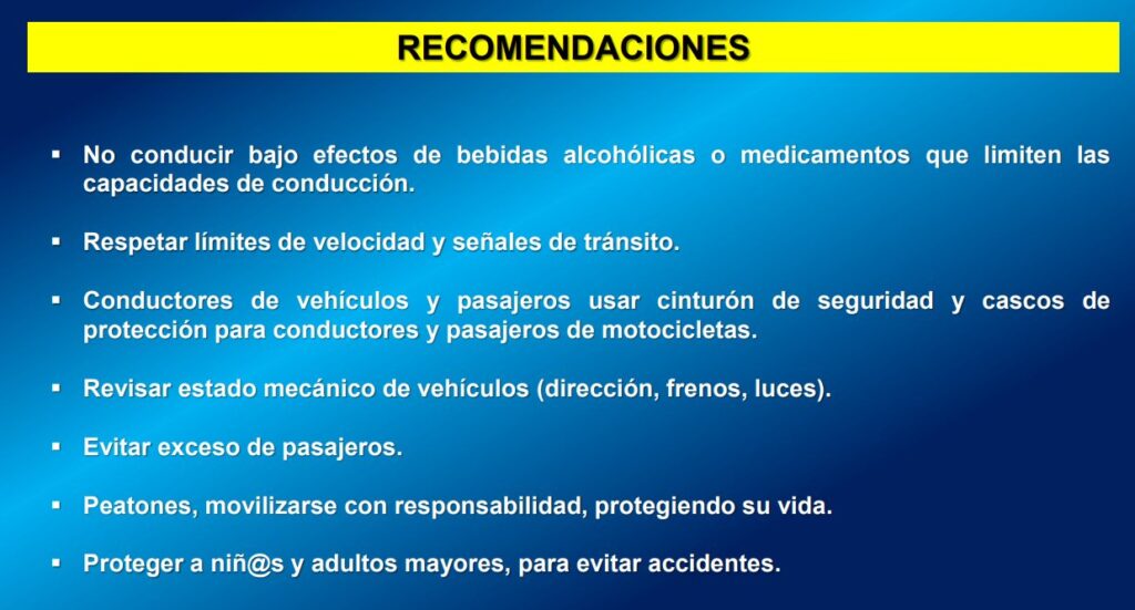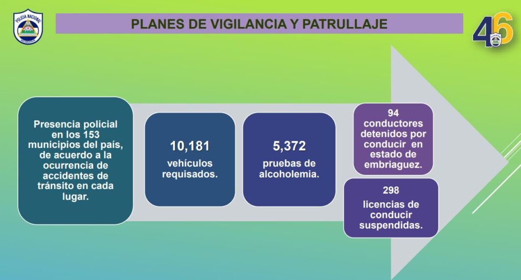 “Dentro del Plan Nacional de Emergencia Vial contemplamos la Campaña Salvá tu Vida, donde realizamos acciones preventivas brindando regulación del tránsito en 74 tramos de carretera. Con unidades de transporte realizamos trabajo, se realizaron 5 mil 185 inspecciones mecánicas, se brindó capacitación a dueños de medios de transporte selectivo y colectivo”, agregó la cojefa policial.