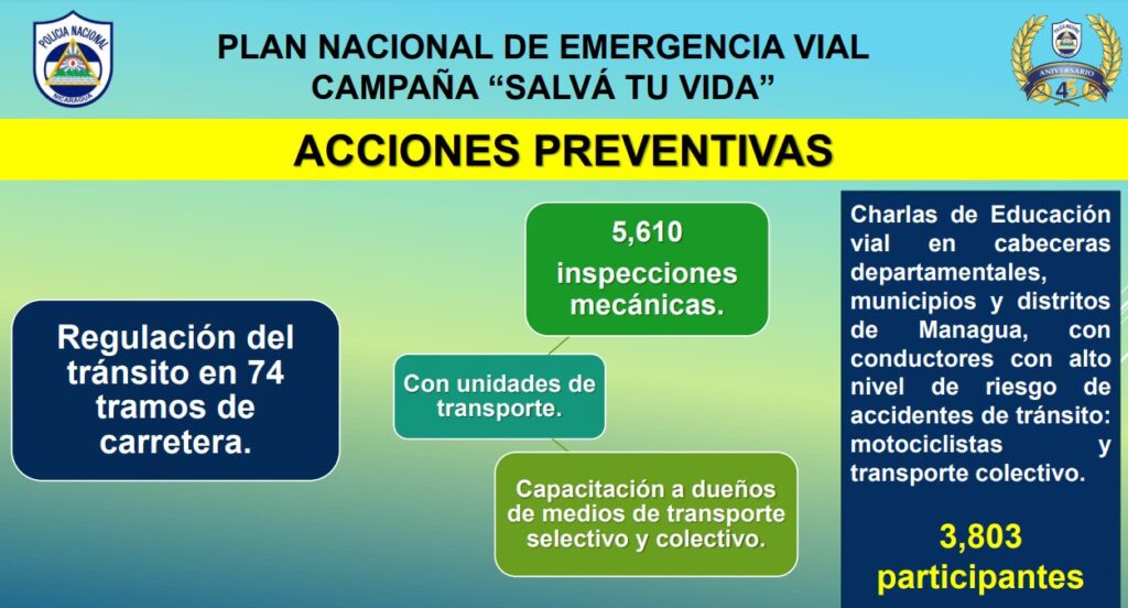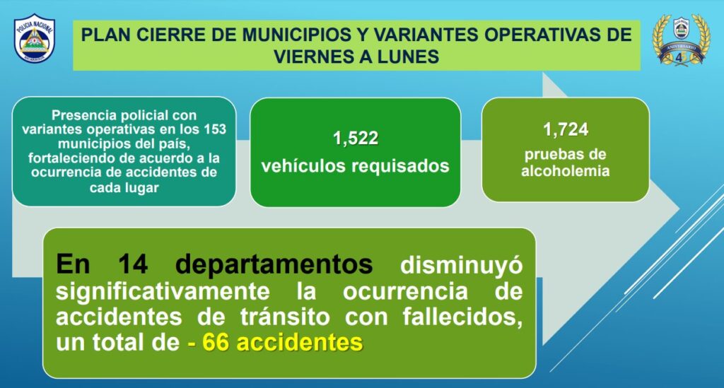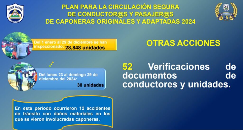 Del lunes 23 al domingo 29 de diciembre del 2024, se inspeccionaron 30 unidades, 52 Verificaciones documentos de conductores y unidades. En este periodo ocurrieron 12 accidentes de tránsito con daños materiales en los que se vieron involucradas caponeras”, agregó el jefe policial.