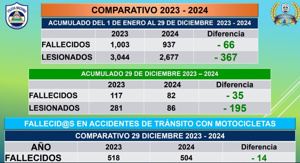 La Policía Nacional informó este martes, que del 1 de enero al 29 de diciembre, se está cerrando con menos 66 muertos y menos 367 lesionados, en relación al mismo período del 2023, contabilizando un total de 937 fallecidos y 2,677 lesionados.