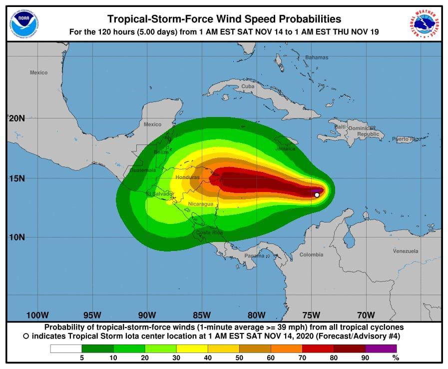 Meteorología / En nueva actualización, el Centro Nacional de Huracanes, advierte que la tormenta tropical Iota avanza lentamente hacia el oeste-suroeste y pronostica su fortalecimiento, con riesgo de vientos peligrosos, marejadas ciclónicas e impactos de lluvia en Centroamérica a partir del lunes.