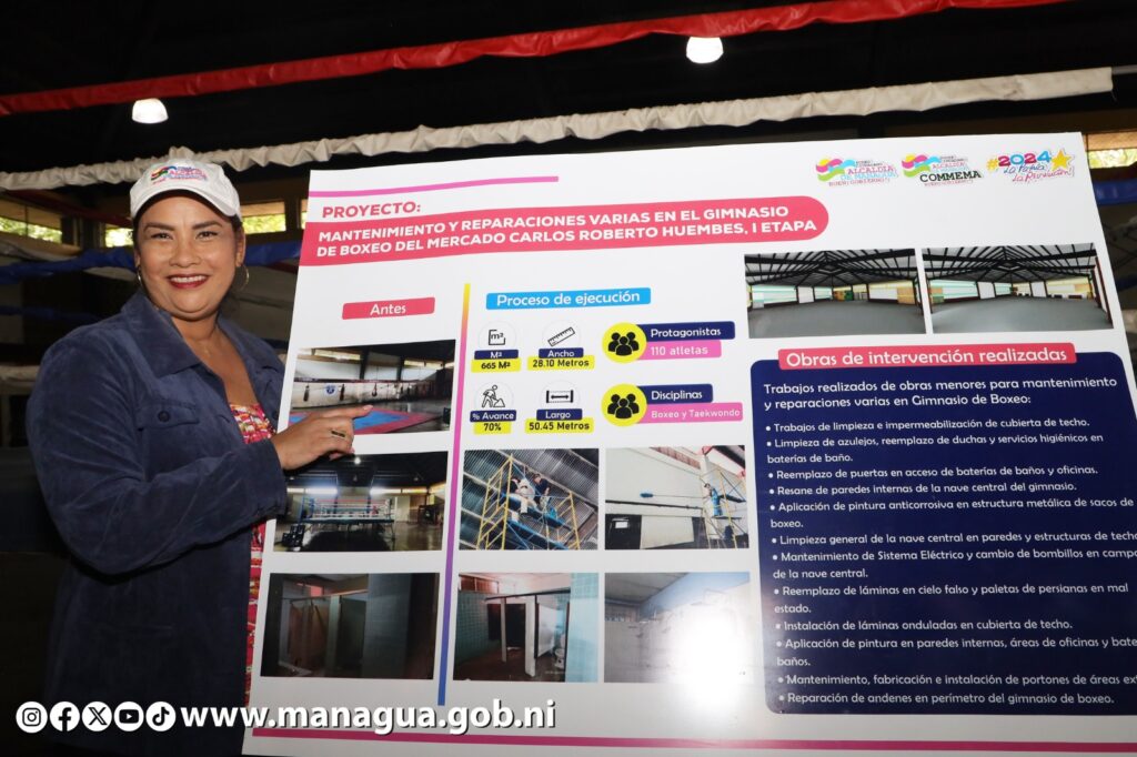 En un 70% avanza la primera etapa de remozamiento del gimnasio en el mercado Roberto Huembes, informó este miércoles la Alcaldesa de Managua, Reyna Rueda, mientras realizaba un recorrido de supervisión a la obra.