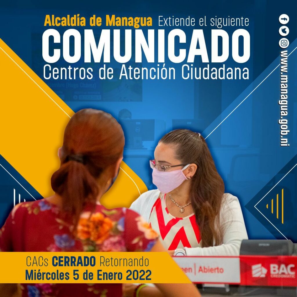 Alcaldía de Managua, informó lo Centros de Atención Ciudadanos estarán cerrados por las festividades de Fin de Año y Año Nuevo.