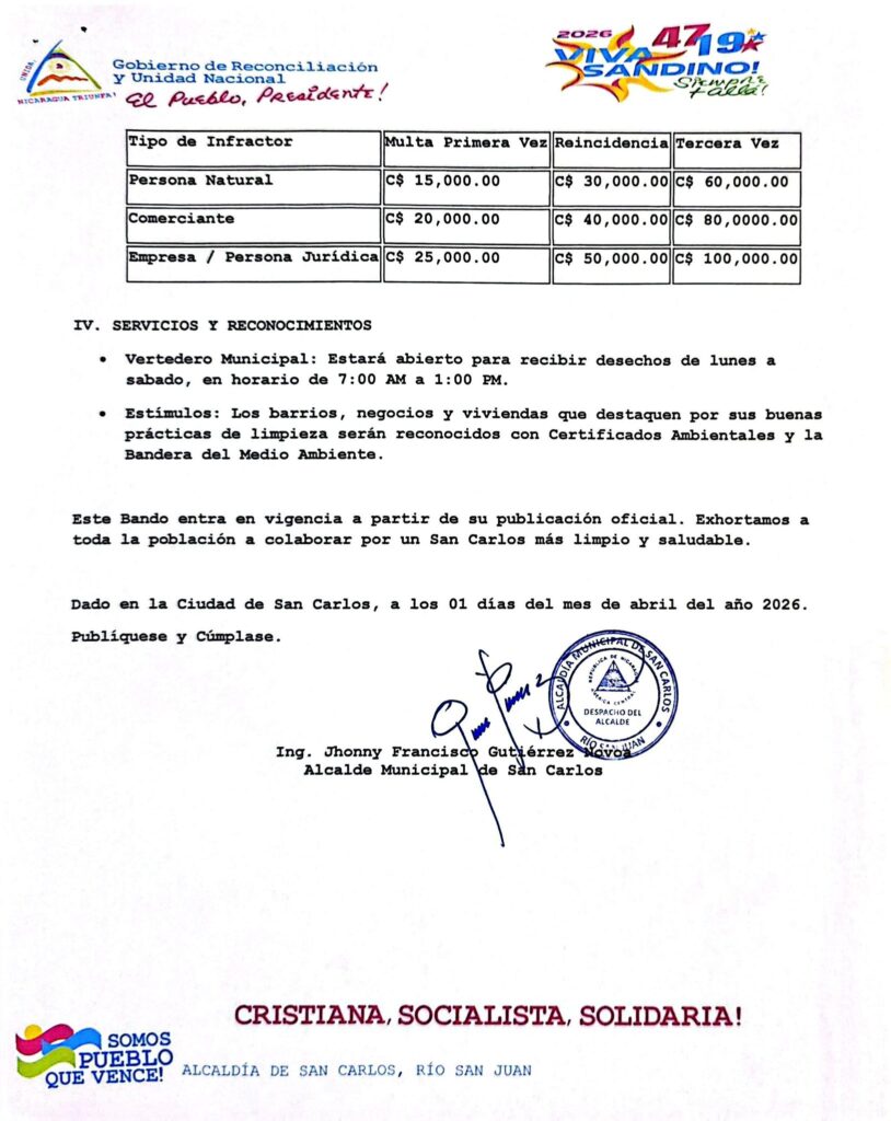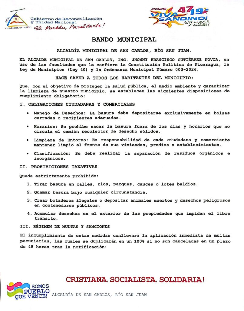 Con multas de hasta 80 mil córdobas, serán ser sancionadas las personas naturales y hasta con 100 mil córdobas las personas jurídicas que tiren basura en lugares no autorizados, quemen desechos o contribuyan a la formación de botaderos ilegales, en el municipio de San Carlos, departamento de Río San Juan.