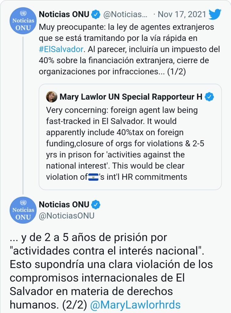 Amnistía Internacional (AI) señaló que la iniciativa, impulsada por el presidente Nayib Bukele y respaldada por el oficialismo que domina el Congreso, reforzaría el “hostigamiento y estigmatización” a organizaciones humanitarias y prensa. “La aprobación del proyecto de ley de agentes extranjeros podría reforzar el hostigamiento y estigmatización que viven organizaciones, personas defensoras de DD.HH., periodistas y medios independientes”, indicó la entidad en un mensaje publicado en Twitter.