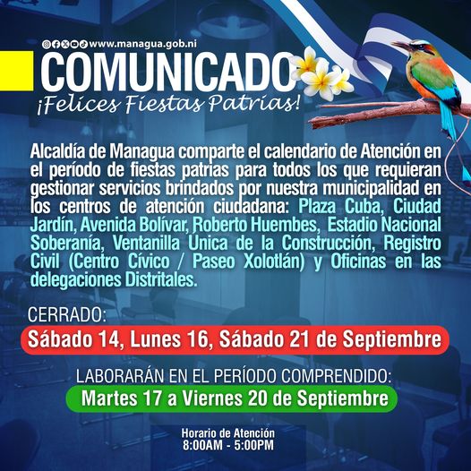 La Alcaldía de Managua informó este jueves a través de un comunicado, el horario de atención en los Centros de Atención Ciudadana, en ocasión de las Fiestas Patrias.
