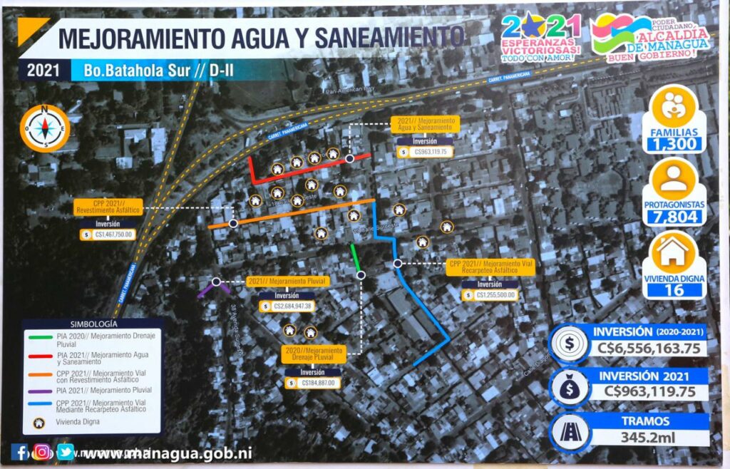 Explicó que en este punto de Managua desde 2020 al 2021 se han invertido C$ 6 millones 556 mil 163.75 córdobas en proyectos de Mejoramiento de Drenaje Pluvial, Mejoramiento de Agua y Saneamiento, Mejoramiento Vial con Revestimiento Asfáltico y Mejoramiento Pluvial, beneficiando a 1, 300 familias.