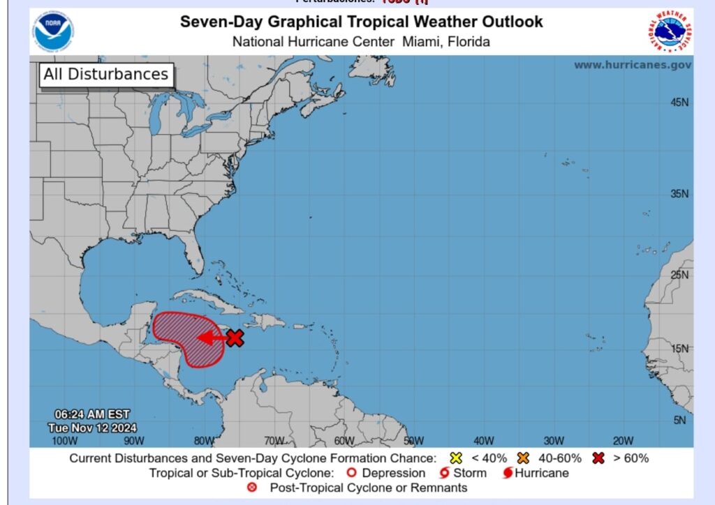A punto de cerrar la temporada ciclónica, meteorólogos alertan hoy sobre el desarrollo de otra depresión tropical en el centro del Mar Caribe, cuya probabilidad de formación es del 80 por ciento durante los próximos siete días.
