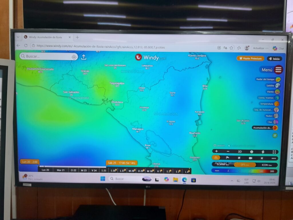 “Es una semana que va a estar un poco más fresca que las semanas anteriores que hemos llegado hasta 40 grados, sobre todo en occidente. Sin embargo, se esperan lluvias en el territorio estos próximos días, en lo que es la costa Caribe Norte y Costa Caribe Sur, ya desde la semana pasada hemos tenido lluvias de débiles a moderadas. Estas continuarán prácticamente en toda la semana, principalmente en horas de la mañana y la tarde. Podríamos tener acumulados de hasta 30 milímetros en estas dos regiones”, explicó este lunes el Director de Cambio Climático del Ineter, Manuel Prado.