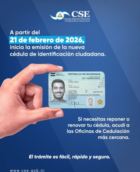 “El Consejo Supremo Electoral (CSE) informa que a partir del 21 de febrero de 2026, entrará en vigencia el nuevo formato de Cédula de Identificación Ciudadana, incorporando nuevas tecnologías para fortalecer la seguridad y la protección de los datos personales”, informó este jueves dicha institución.