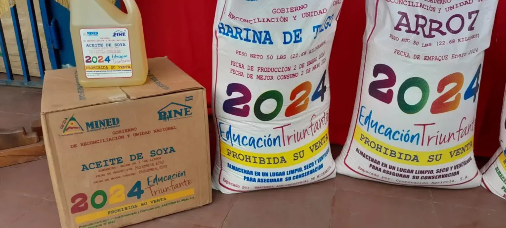 “La segunda entrega para la merienda escolar, consiste en 44 mil quintales de arroz, 44 mil de cereal, 32 mil de frijoles, 42 mil de maíz, 8 mil de harina de trigo, esto es para la Costa Caribe según su cultura; y 170 mil galones de aceite”, detalló la vicemandataria.