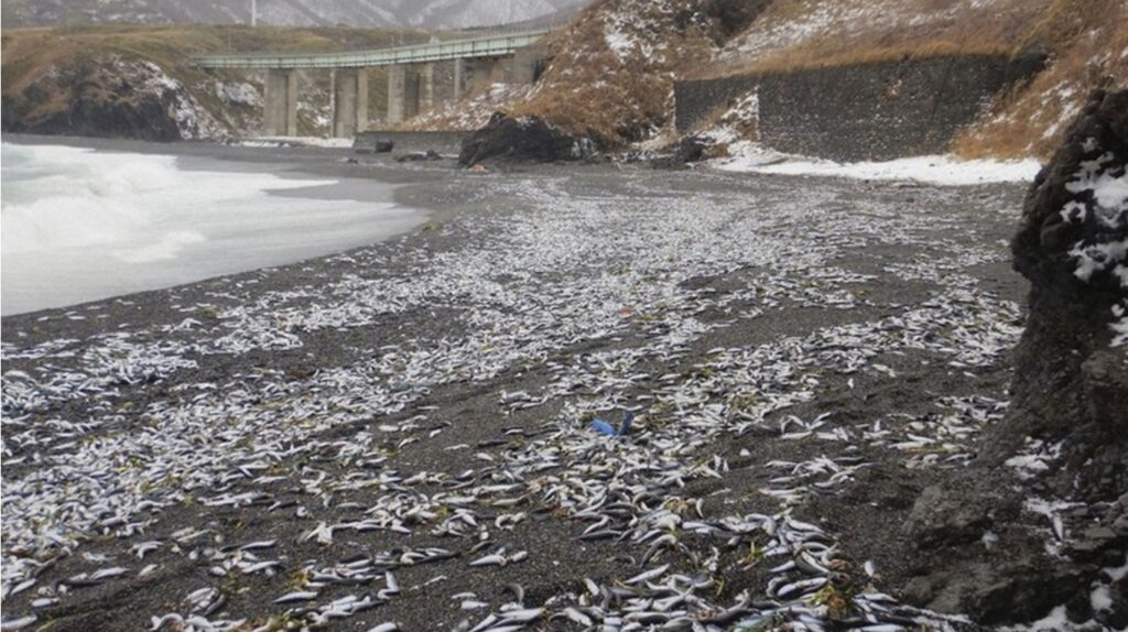 De acuerdo con el medio Nippon TV, el 28 de diciembre las autoridades de Matsumae informaron a los funcionarios de la cooperativa pesquera local de que varias docenas de toneladas de sardinas habían sido arrastradas por la corriente a lo largo de un tramo de 900 metros de playa.