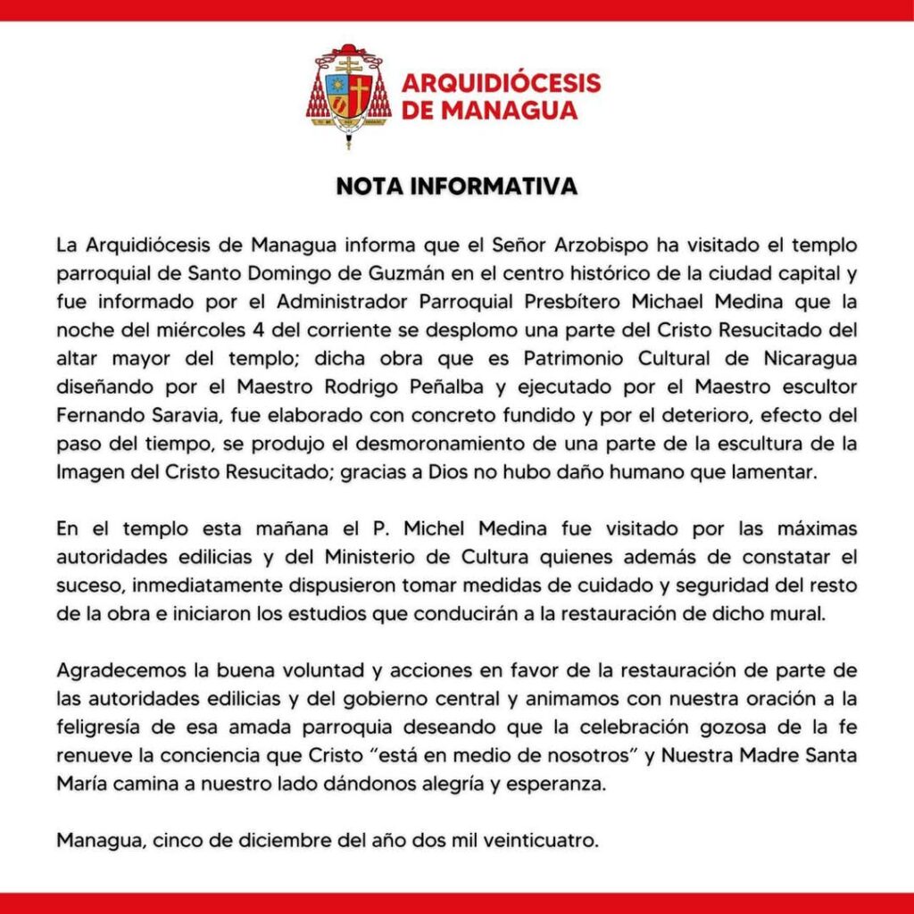 A través de una nota de prensa las autoridades de la Arquidiócesis de Managua agradecieron este viernes, el apoyo del Gobierno Central en la restauración del Cristo Resucitado que colapsó el pasado miércoles en la iglesia Santo Domingo de la capital.