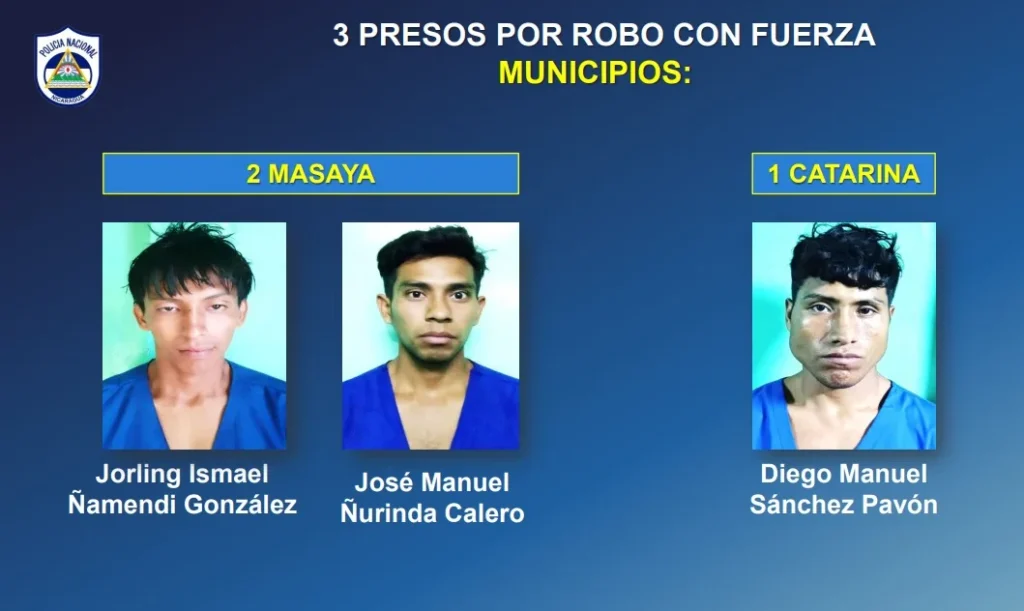 Finalmente, Jorling Ismael Ñaméndiz González, José Manuel Ñurinda Calero y Diego Manuel Sánchez Pavón fueron encarcelados por cometer robos con fuerza en los municipios de Masaya y Catarina.