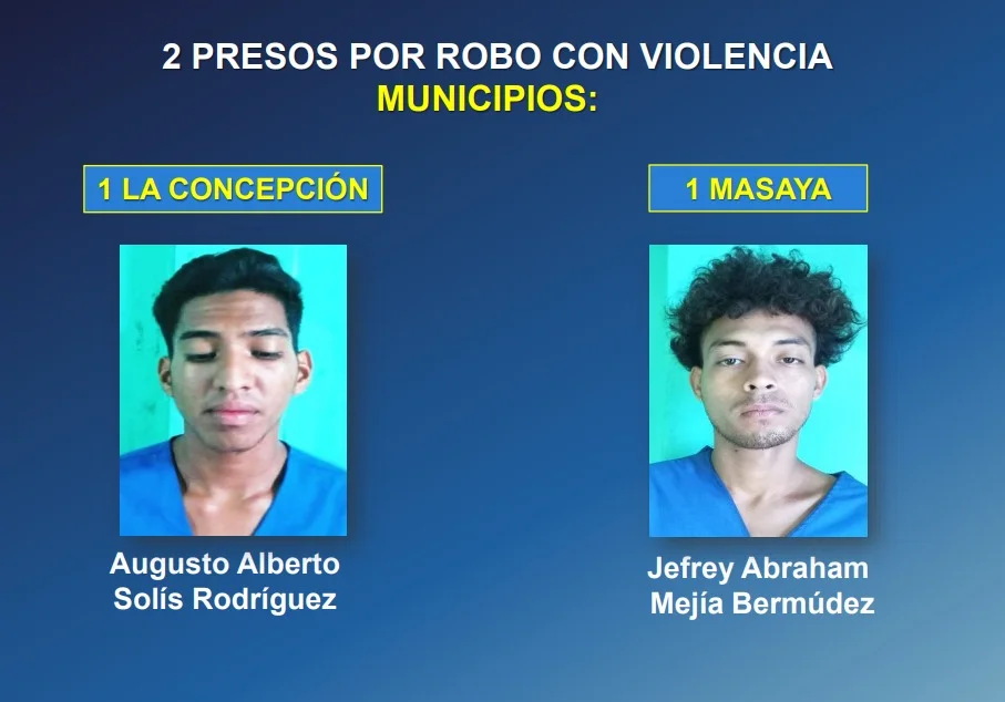 Por otra parte, en los municipios de La Concepción y Masaya fueron capturados Augusto Alberto Solís Rodríguez y Jefrey Abraham Mejía Bermúdez quienes cometieron robos con violencia.