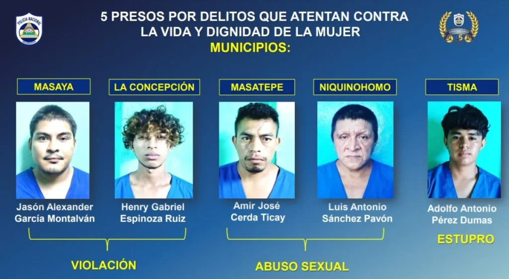 Mientras tanto, Amir José Cerda Ticay y Luis Antonio Sánchez Pavón fueron detenidos por abuso sexual en los municipios de Masatepe y Niquinohomo, y Adolfo Antonio Pérez Dumas, por el delito de estupro en Tisma.