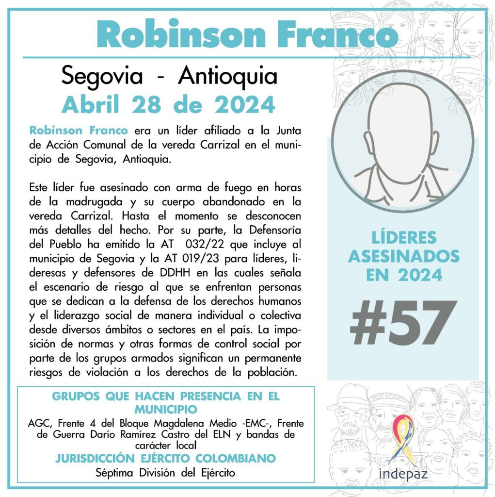 En Colombia han asesinado al 57.º líder social en lo que va del 2024. Robinson Franco, afiliado a la Junta de Acción Comunal de la vereda Carrizal en el municipio de Segovia, en Antioquia, fue matado a tiros en la madrugada del domingo.