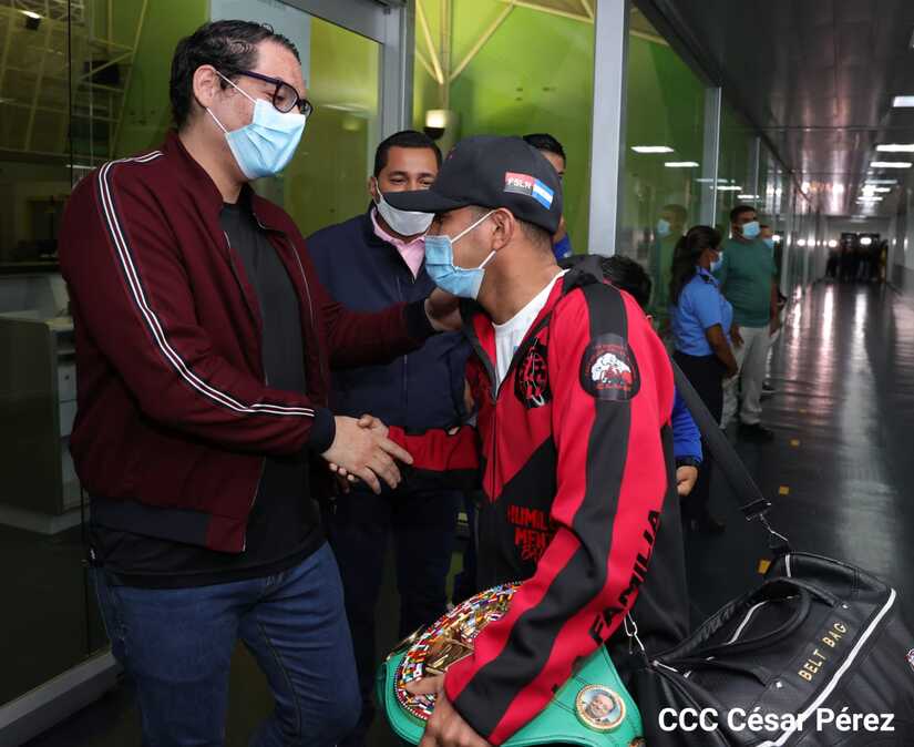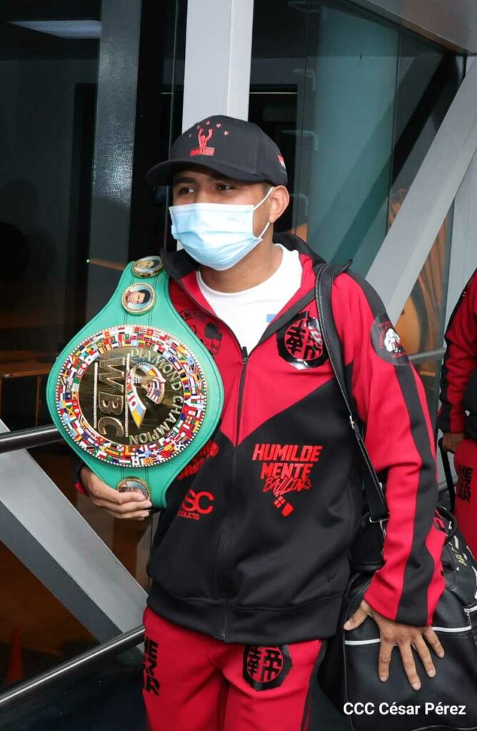 El boxeador nicaragüense fue recibido en el Aeropuerto Internacional Augusto C. Sandino por el vicealcalde, Enrique Armas; el Coordinador Nacional de la juventud Sandinista 19 de Julio, Milton Ruiz y el compañero Maurice Ortega Murillo.