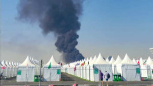 Densas columnas de humo negro se elevaron este sábado desde las inmediaciones de la ‘fan zone’ en Qetaifan Island North,