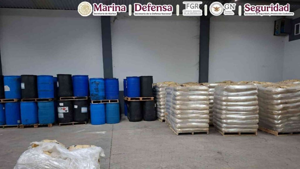Un comunicado del gabinete de seguridad detalla que durante la ejecución de las órdenes de cateo también se incautaron 44 tambos con 200 litros de metilamina cada uno (un estimado de ocho mil 800 litros de precursores químicos), así como material diverso para la elaboración de estupefacientes.