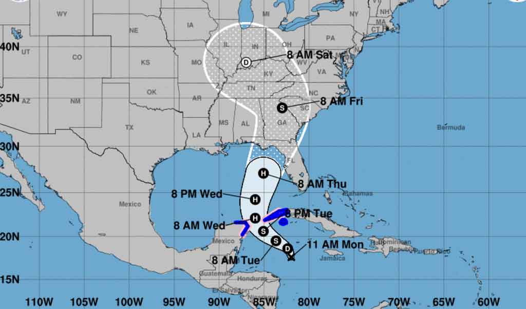 Los vientos máximos sostenidos están cerca de 45 kilómetros por hora con ráfagas más fuertes y el NHC prevé que un fortalecimiento durante los próximos días, hasta convertirse en huracán el miércoles y continuar ganando intensidad a medida que se mueve a través del noroeste del Mar Caribe y hacia el sureste del Golfo de México.