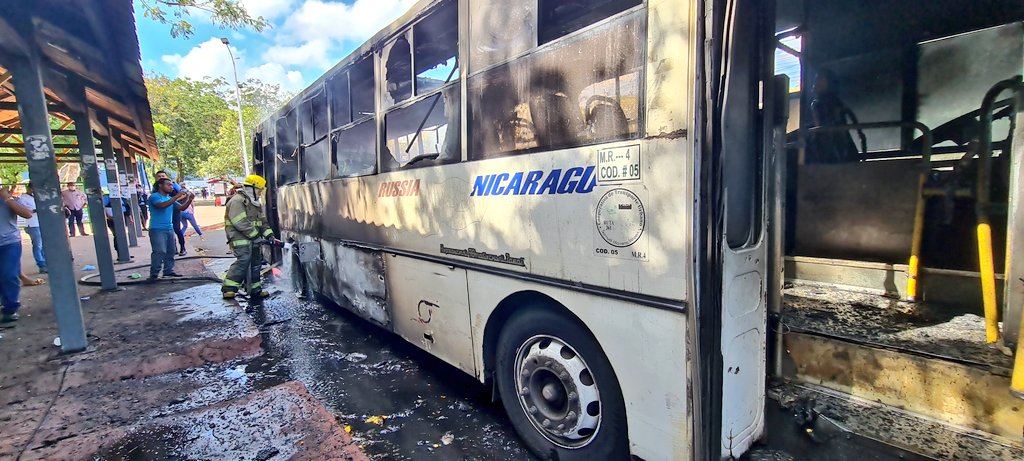Una unidad de pasajeros de la mini ruta 4 quedó totalmente calcinada al tomar fuego en el sector de la rotonda El Guegüense, Plaza España en Managua.