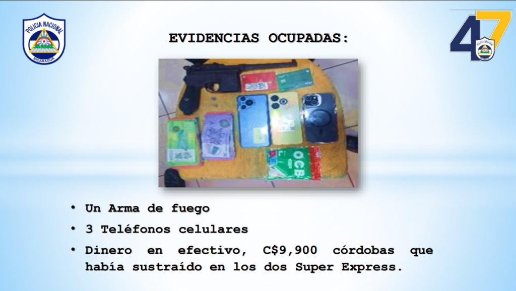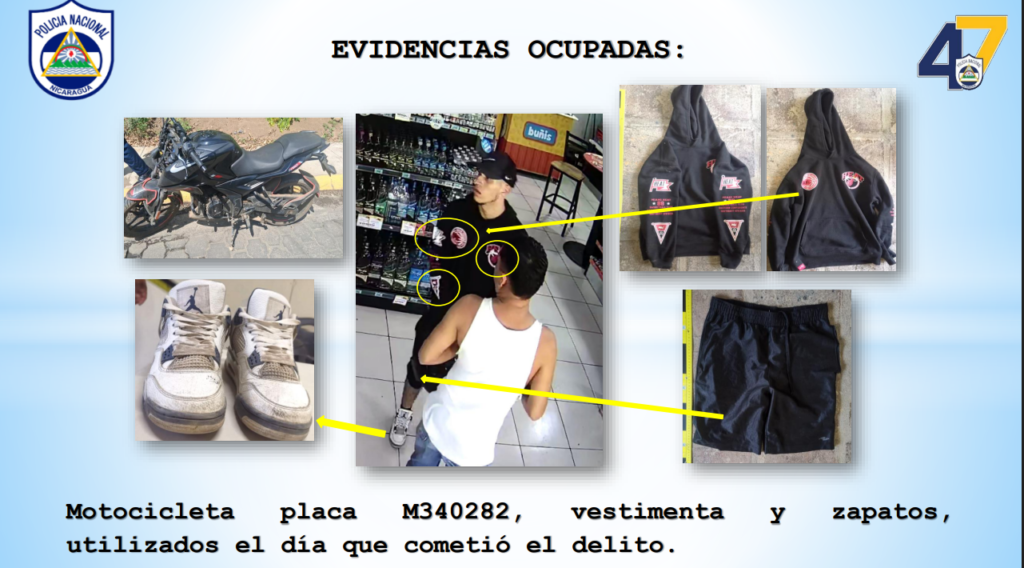 Además de la moto matrícula M-304-282, la policía le incautó como evidencias, el dinero en efectivo, tres celulares, un arma de fuego, la vestimenta y zapatos usados en los dos robos, los que servirán de evidencia en la acusación por el delito de robo con intimidación.