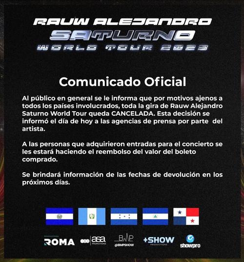 “Por temas propios de la producción del artista Rauw Alejandro y por motivos ajenos a la productora local, se CANCELA la gira Saturno World Tour que estaba programada, para brindar un espectáculo en más de 10 países de Latinoamérica incluyendo Nicaragua”, señaló el texto.
