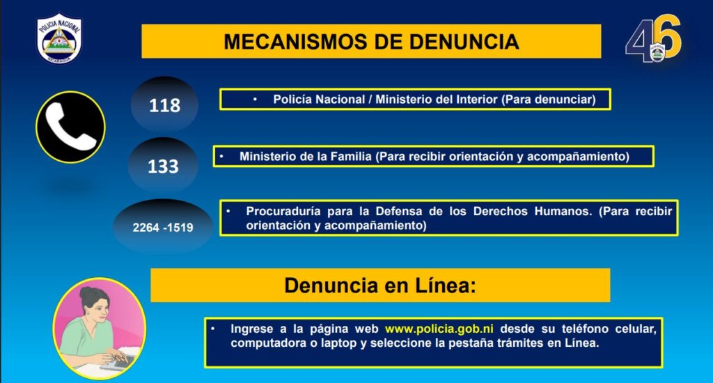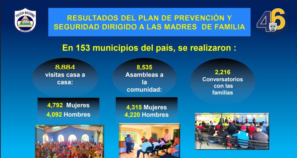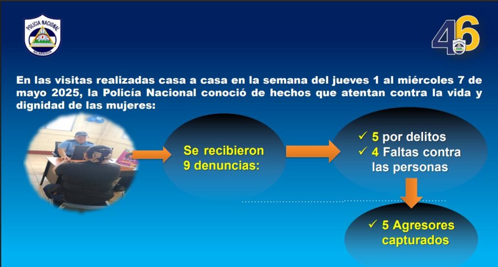 En su informe, recalcó la apertura esta semana de dos Comisarías de la Mujer, la número 420 ubicada en Mina de Limón, municipio de Malpaisillo, departamento de León y la 421 en el municipio de San Francisco del Norte, departamento de Chinandega.