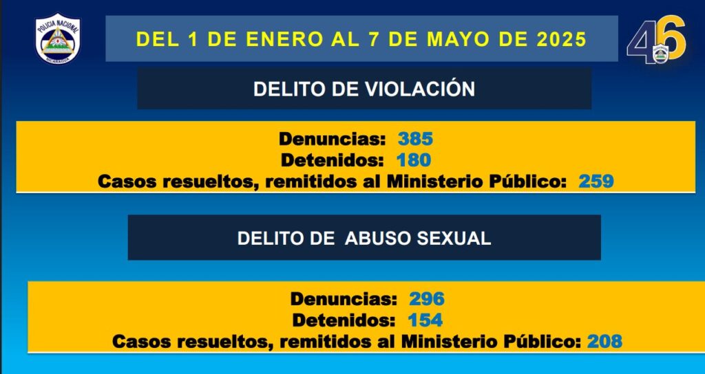 “En el periodo del primero de enero al 7 de mayo del 2025 en los delitos de violación llevamos 385 de denuncias, 180 detenidos, 259 casos resueltos y remitidos al Ministerio Público; en los delitos de abuso sexual, 296 denuncias, 154 detenidos, casos resueltos y remitidos al Ministerio Público 208”, detalló este jueves la Cojefa de Relaciones Públicas de la institución del orden público, subcomisionada Karen Obando.
