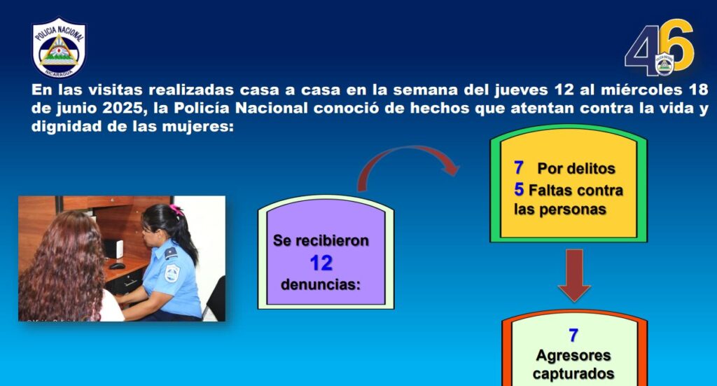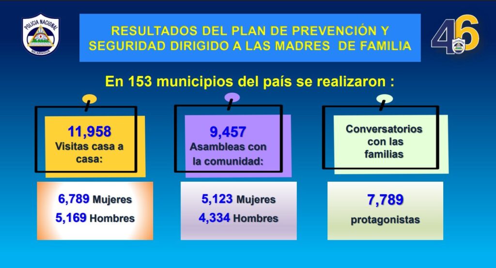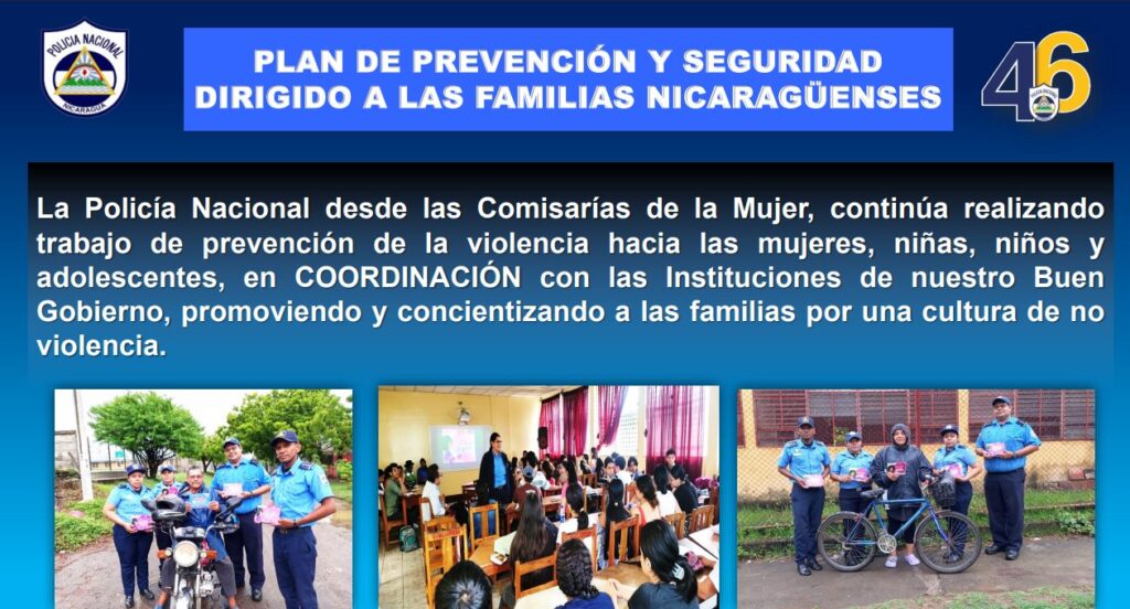 De acuerdo al último informe sobre los resultados del Plan de Prevención y Seguridad de las Comisarías de la Mujer, se “continúa realizando trabajo de prevención hacia la violencia de las mujeres, niñas, niños y adolescentes en coordinación con las instituciones de nuestro Buen Gobierno, promoviendo y concienciando a las familias nicaragüenses por una cultura de no violencia”.