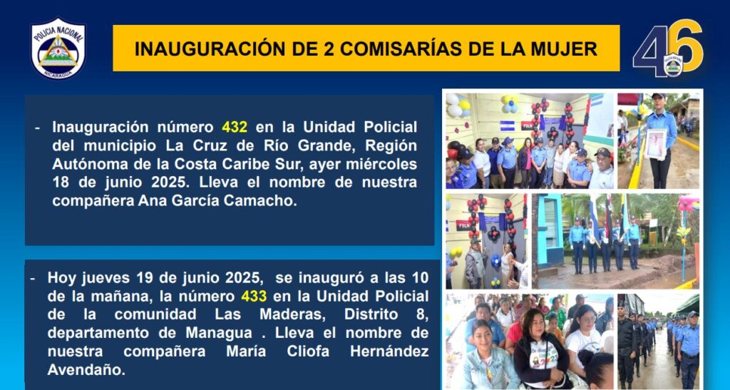 Asimismo, esta semana se inauguraron dos Comisarías de la Mujer, las números 432 y 433, una en la comunidad Las Maderas en el Distrito VIII de Managua y la otra en la Cruz de Río Grande en el Caribe Sur.